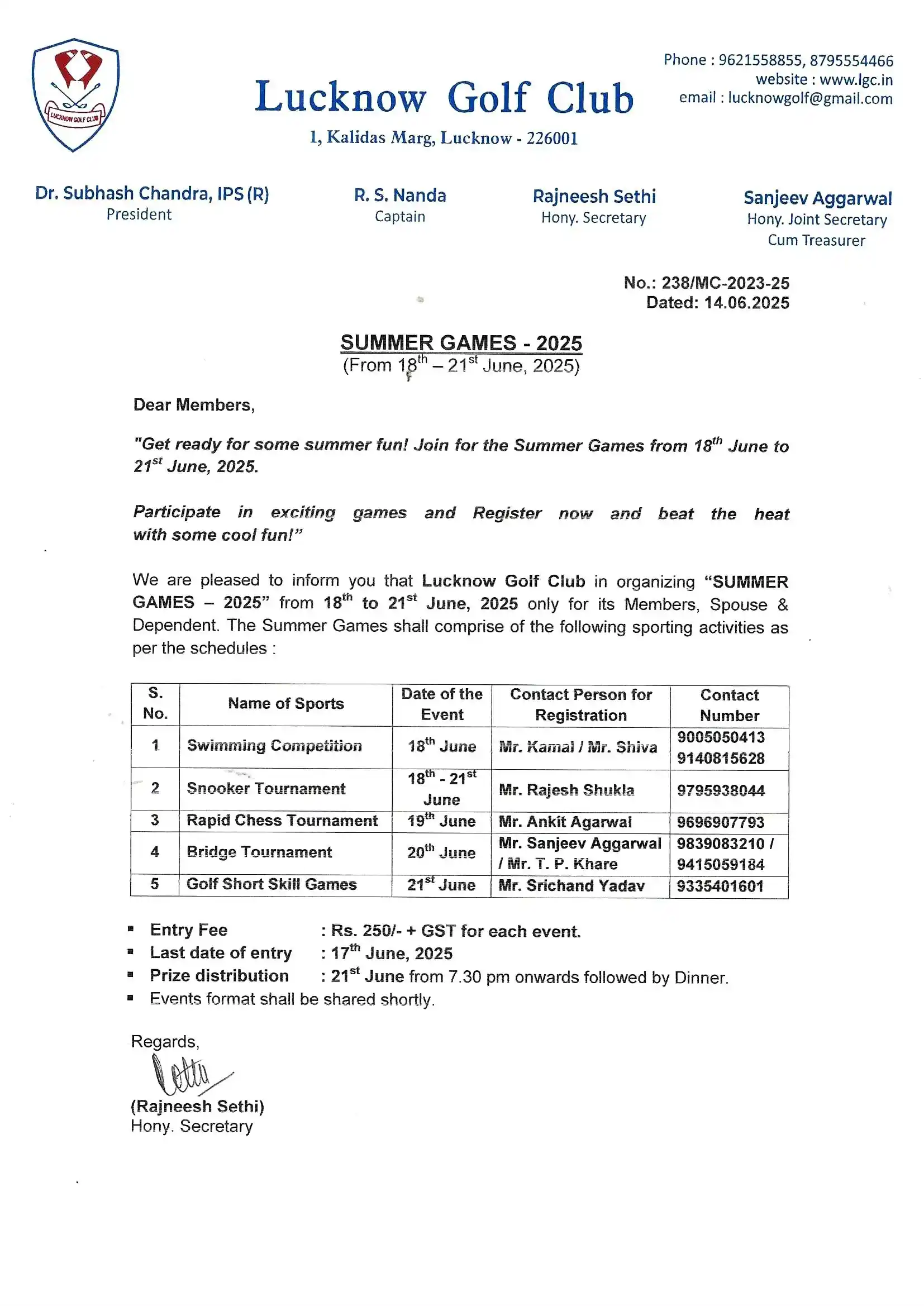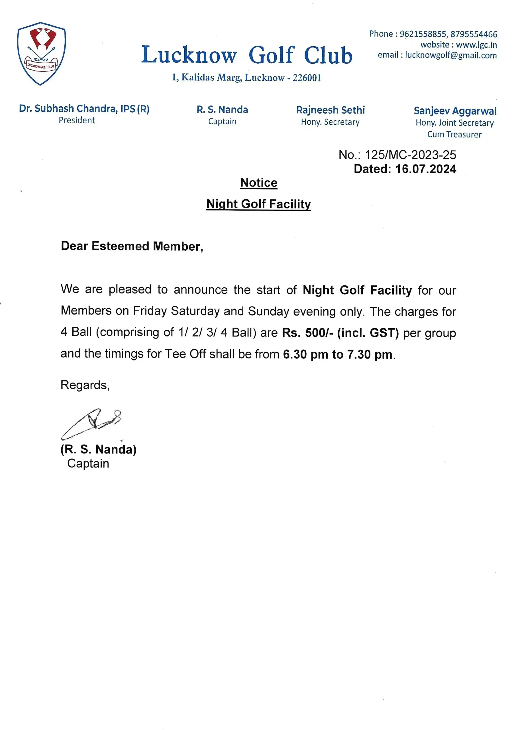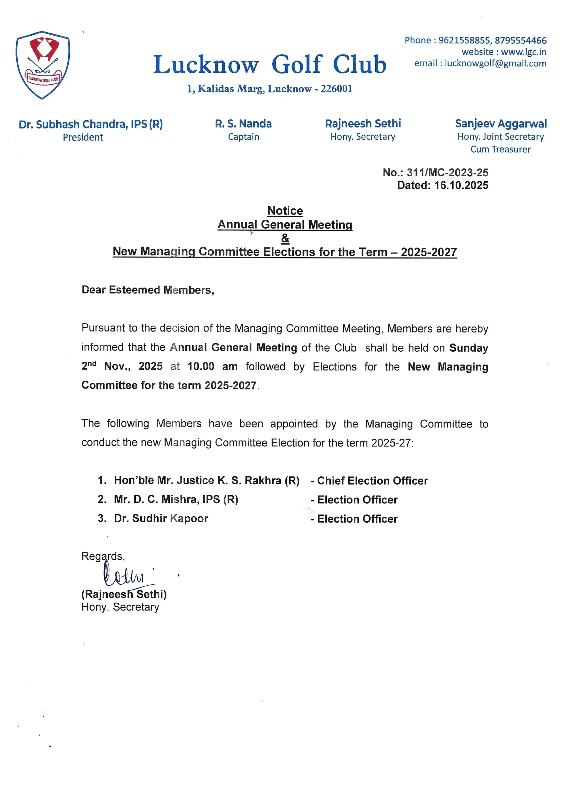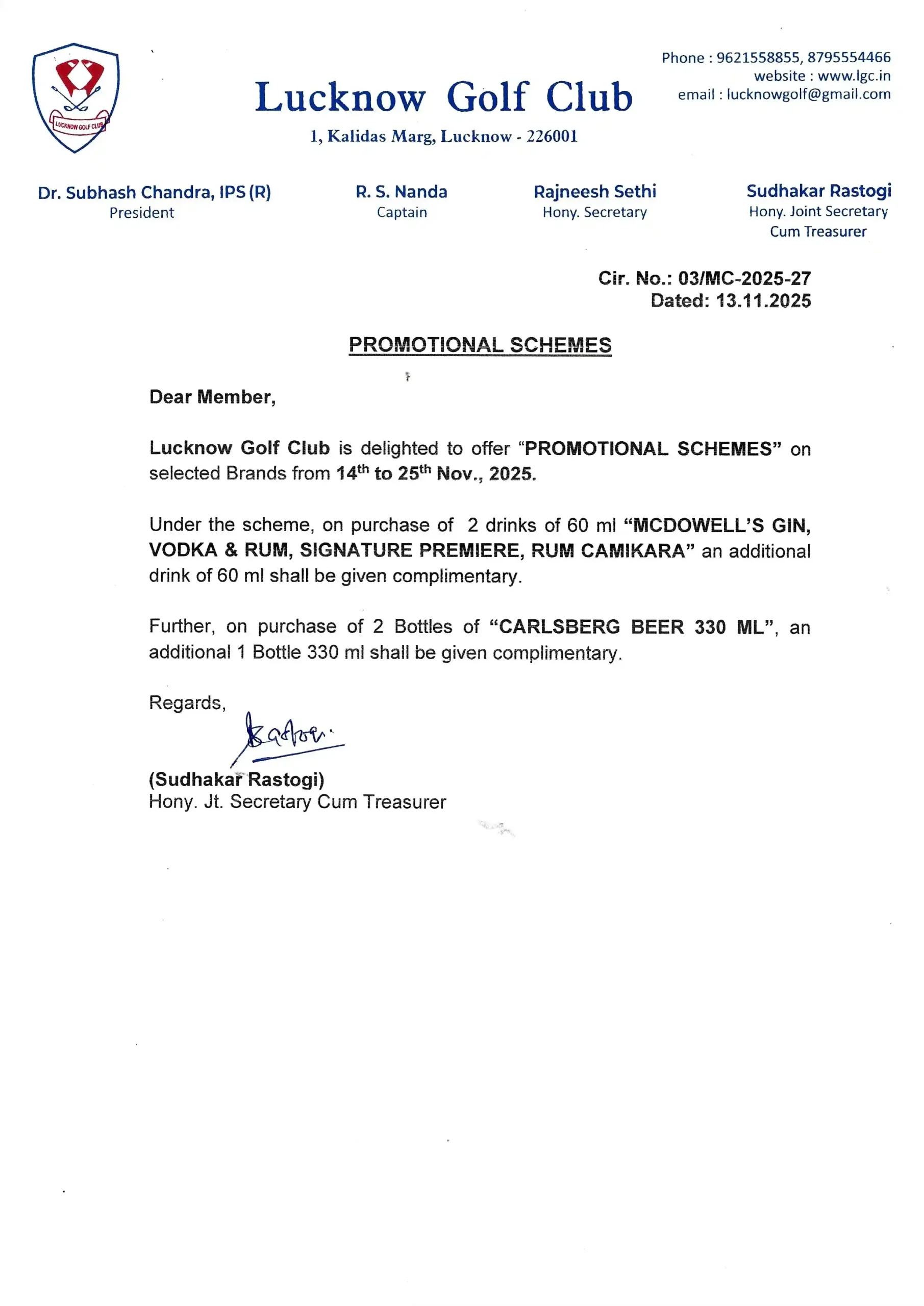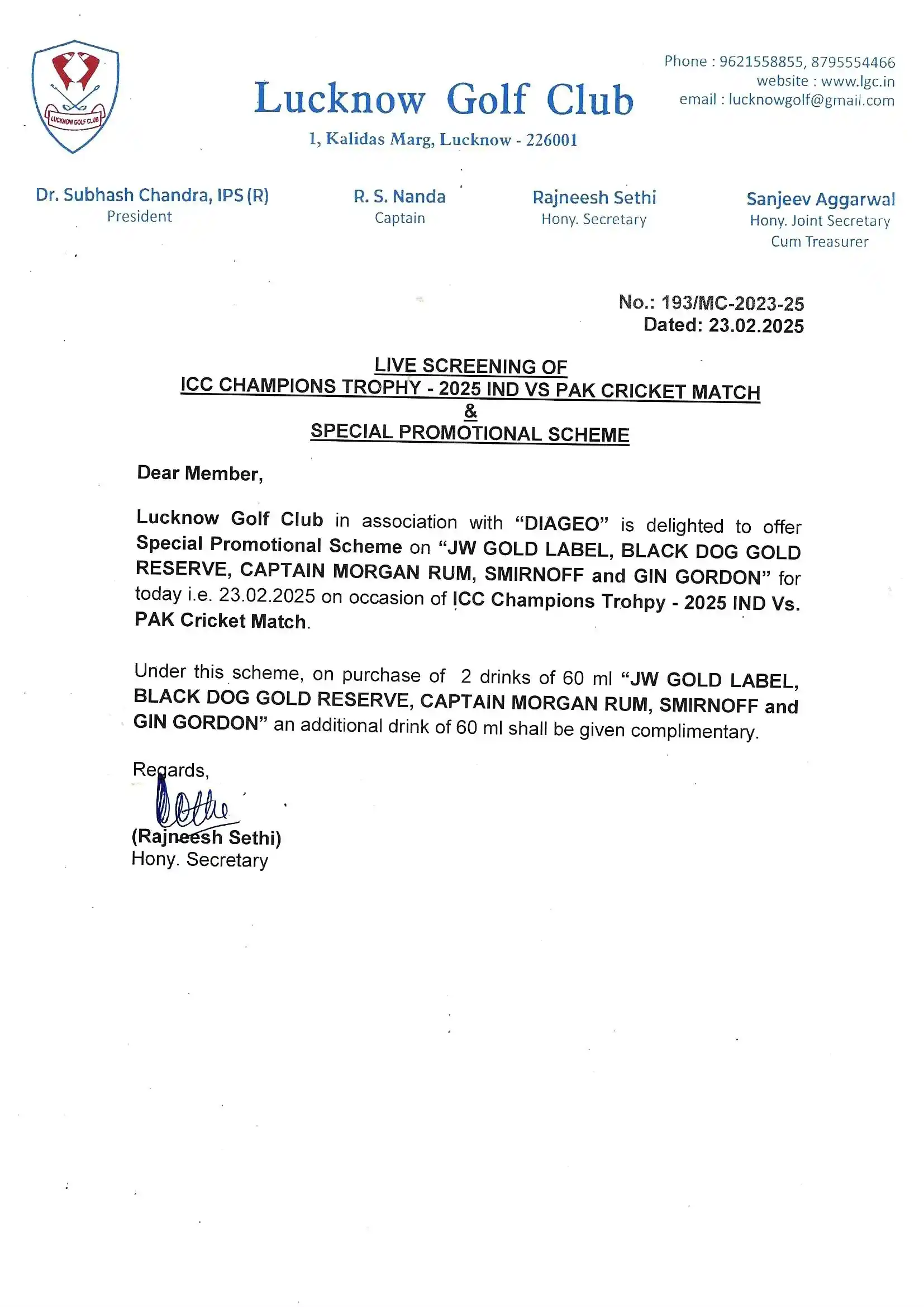 PROMOTIONAL SCHEMES dt. 13.11.2025 GFI Tour - 2025 Golf Tournament LGC ELECTIONS - 2025 FINAL LIST OF CONTESTANTS Notice - AGM & New Managing Committee Elections Notice & Agenda Annual General Meeting Diwali Nite - 2025 SGPGI BREAST HEALTH PROGRAM - PINK WAVE SUNDAY / FUNDAY Special Weekend Breakfast Menu Golf Driving Range Cum Practice Area Inauguration of Golf Driving Range & Practice Area MANGO FOOD FESTIVAL ITALIAN FOOD FEST SUMMER GAMES – 2025 FINAL EXTENSION OF ANNUAL SUBSCRIPTION CHARGES GYMNASIUM SUBSCRIPTION CHARGES & TIMINGS PRESIDENT’S CUP GOLF TOURNAMENT - 2025 SINGING IDOL SEASON-2 SWIMMING POOL SESSION - 2025 CAPTAINS CUP GOLF TOURNAMENT Powered by Indian Oil Grand Holi Celebration Event Holi Special Promotional Scheme Local Rules w.e.f. 05.03.2025 IND-PAK CRICKET MATCH SPECIAL PROMOTIONAL SCHEME Notice Flag Hoisting Ceremony ECSTASY– 2025 New Year Eve Celebrations Event Local Rules Revision of Monthly Subscription charges CHRISTMAS - 2024 CELEBRATION Banqueting at Pool Side (LGC Swimming Pool) DIWALI NITE Grand Dussehra Celebration & Dandiya Night Author’s Meet & Tambola Evening 9 HOLE VETERANS & OPEN CATEGORY GOLF TOURNAMENT MEXICAN FOOD FESTIVAL 78th Independence Day Special Menu NOTICE INDEPENDENCE DAY - FLAG HOISTING Notice Night Golf Practice Timings Monsoon Cup Golf Tournament Powered by Eldeco Notice Club Rules Night Golf Facility Notice Revision of Green Fees Summer Games – 2024 SWIMMING COMPETITION Summer Games – 2024 Night Golf Tournament Inauguration of “LGC Wellness Centre NOTICE - ANNUAL GENERAL MEETING NOTICE - EXTRA ORDINARY GENERAL MEETING ANNUAL SUBSCRIPTION AMOUNT DEPOSIT DATE EXTENDED Subscription Charges for Outstation Members Rebate @10% on Annual Subscription Payment NOTICE - HIRING OF GOLF CARTS SARACA CAPTAIN’S CUP GOLF TOURNAMENT LIVE STREAMING OF IPL-2024 INNAUGURAL MATCH NOTICE GOLF TOURNAMENTS GRAND HOLI CELEBRATION Notice - Live Screening of Consecration Ceremony