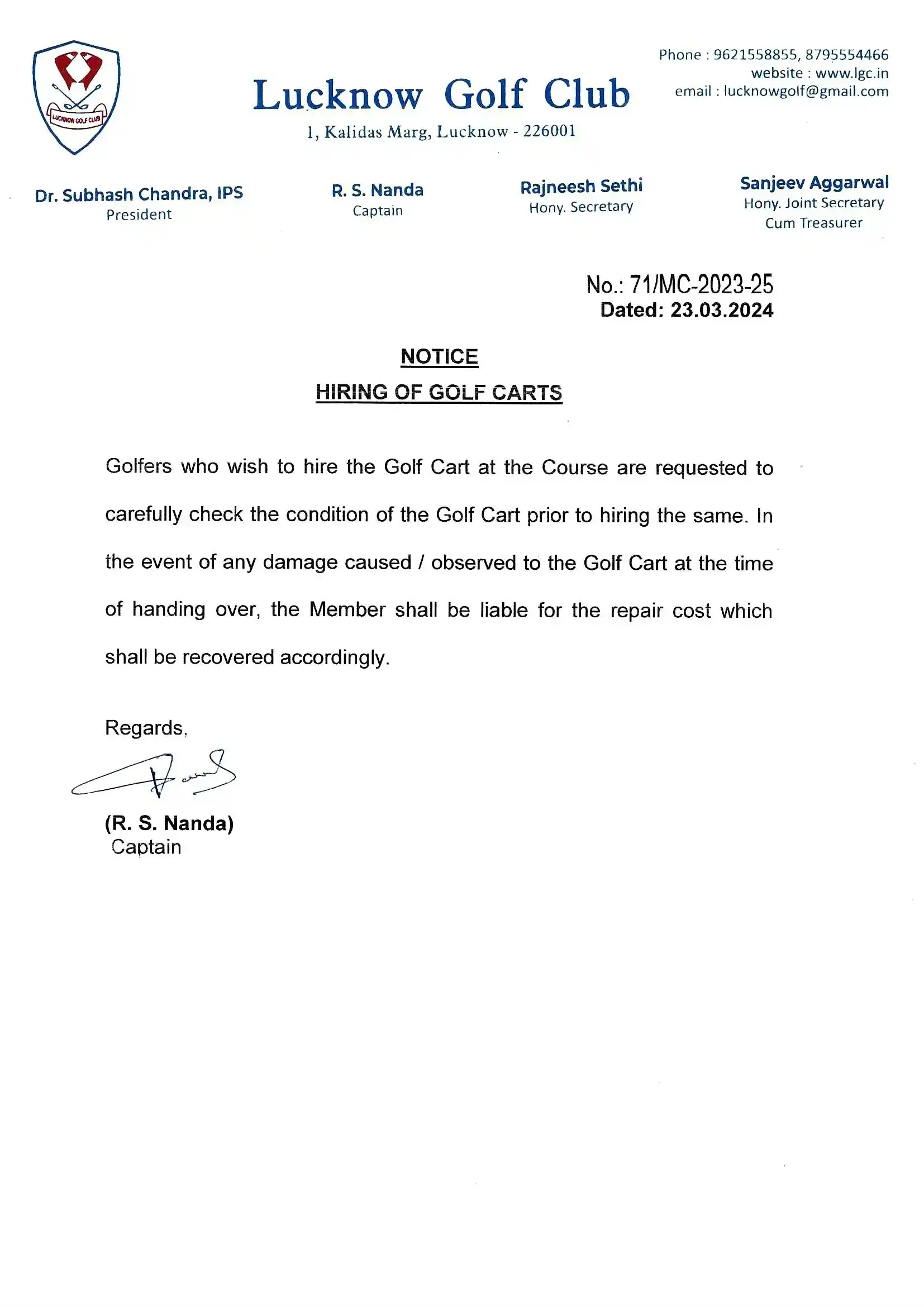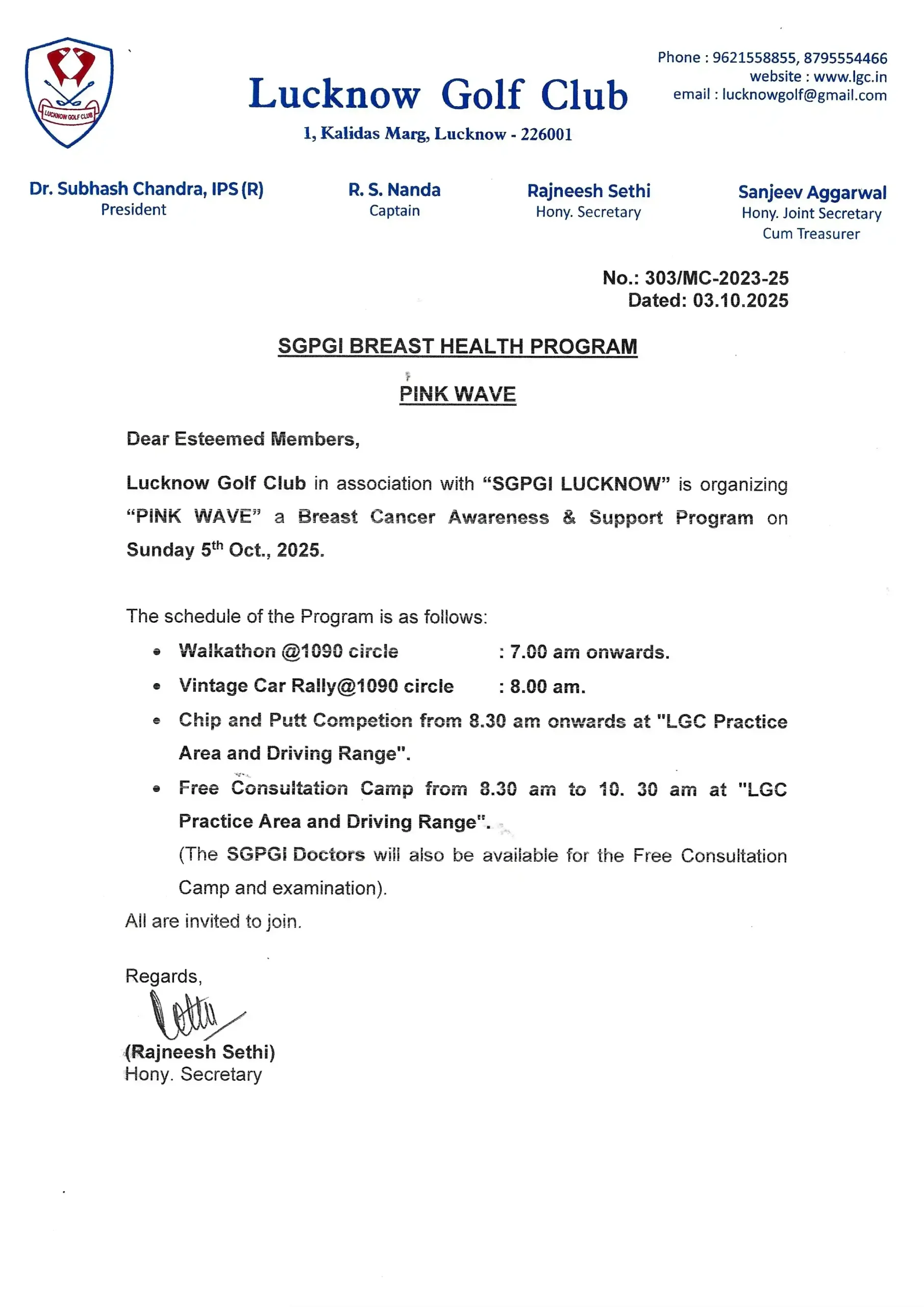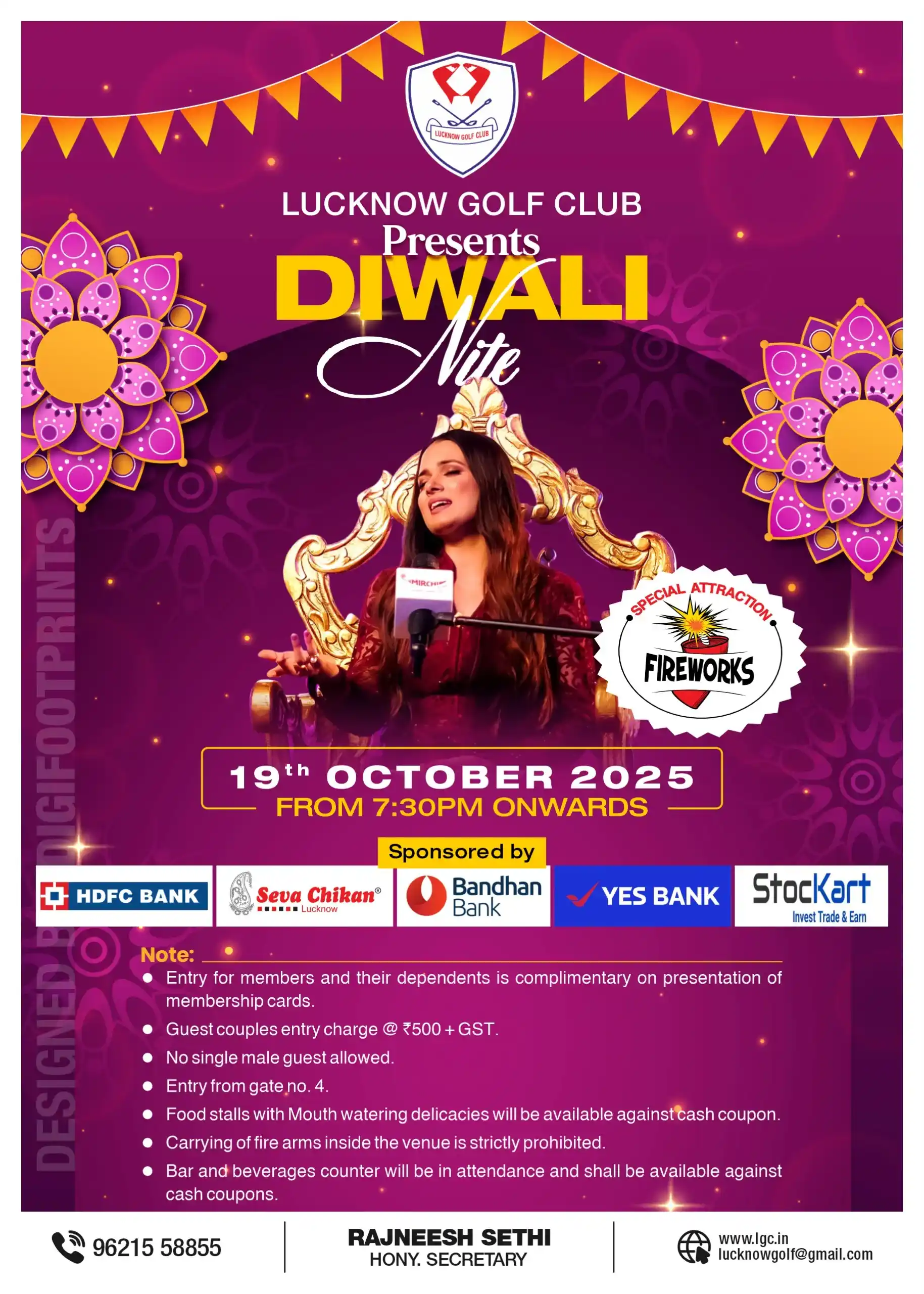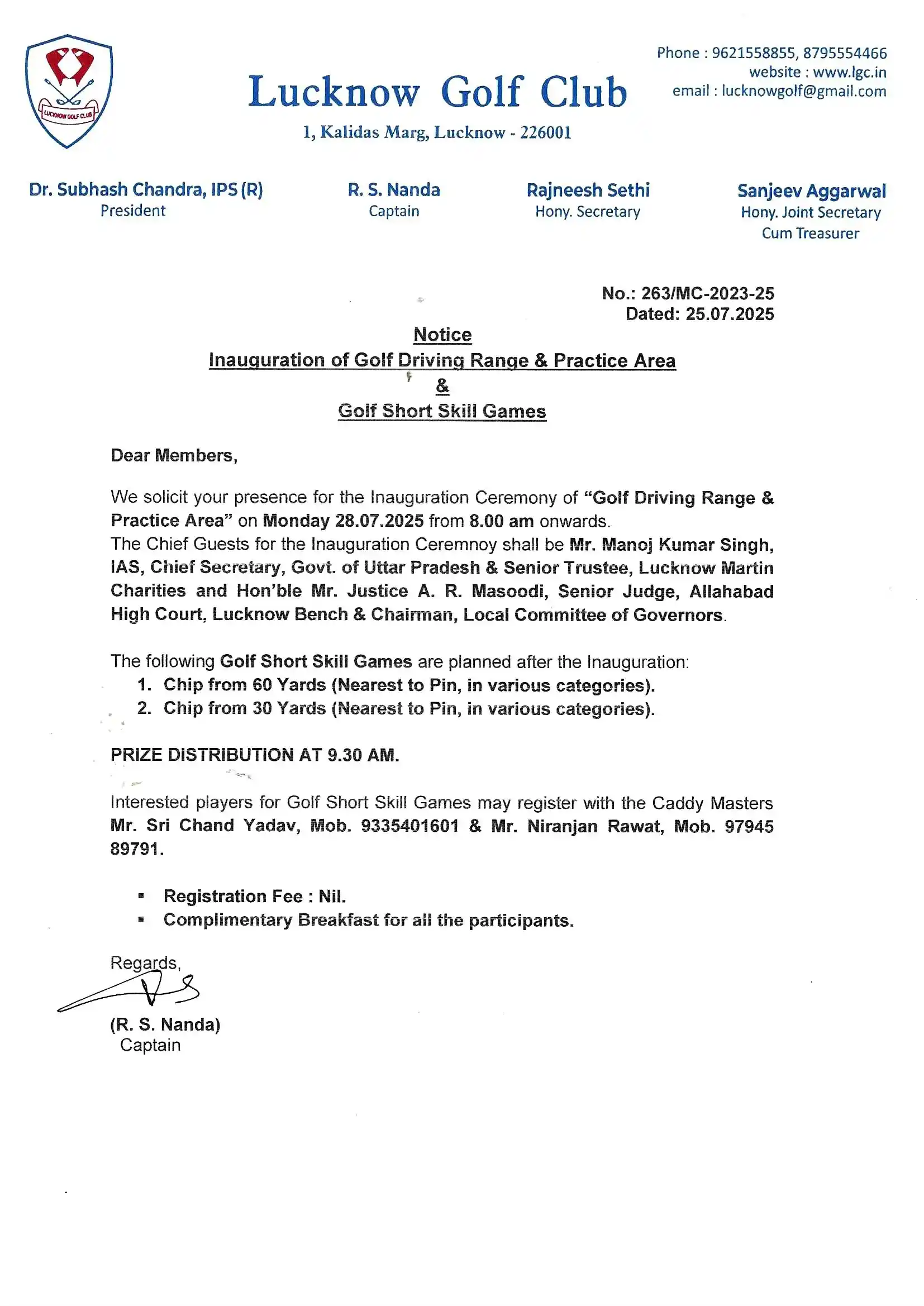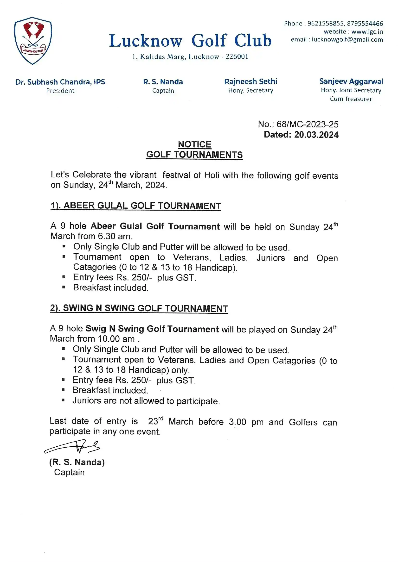 PROMOTIONAL SCHEMES dt. 13.11.2025 GFI Tour - 2025 Golf Tournament LGC ELECTIONS - 2025 FINAL LIST OF CONTESTANTS Notice - AGM & New Managing Committee Elections Notice & Agenda Annual General Meeting Diwali Nite - 2025 SGPGI BREAST HEALTH PROGRAM - PINK WAVE SUNDAY / FUNDAY Special Weekend Breakfast Menu Golf Driving Range Cum Practice Area Inauguration of Golf Driving Range & Practice Area MANGO FOOD FESTIVAL ITALIAN FOOD FEST SUMMER GAMES – 2025 FINAL EXTENSION OF ANNUAL SUBSCRIPTION CHARGES GYMNASIUM SUBSCRIPTION CHARGES & TIMINGS PRESIDENT’S CUP GOLF TOURNAMENT - 2025 SINGING IDOL SEASON-2 SWIMMING POOL SESSION - 2025 CAPTAINS CUP GOLF TOURNAMENT Powered by Indian Oil Grand Holi Celebration Event Holi Special Promotional Scheme Local Rules w.e.f. 05.03.2025 IND-PAK CRICKET MATCH SPECIAL PROMOTIONAL SCHEME Notice Flag Hoisting Ceremony ECSTASY– 2025 New Year Eve Celebrations Event Local Rules Revision of Monthly Subscription charges CHRISTMAS - 2024 CELEBRATION Banqueting at Pool Side (LGC Swimming Pool) DIWALI NITE Grand Dussehra Celebration & Dandiya Night Author’s Meet & Tambola Evening 9 HOLE VETERANS & OPEN CATEGORY GOLF TOURNAMENT MEXICAN FOOD FESTIVAL 78th Independence Day Special Menu NOTICE INDEPENDENCE DAY - FLAG HOISTING Notice Night Golf Practice Timings Monsoon Cup Golf Tournament Powered by Eldeco Notice Club Rules Night Golf Facility Notice Revision of Green Fees Summer Games – 2024 SWIMMING COMPETITION Summer Games – 2024 Night Golf Tournament Inauguration of “LGC Wellness Centre NOTICE - ANNUAL GENERAL MEETING NOTICE - EXTRA ORDINARY GENERAL MEETING ANNUAL SUBSCRIPTION AMOUNT DEPOSIT DATE EXTENDED Subscription Charges for Outstation Members Rebate @10% on Annual Subscription Payment NOTICE - HIRING OF GOLF CARTS SARACA CAPTAIN’S CUP GOLF TOURNAMENT LIVE STREAMING OF IPL-2024 INNAUGURAL MATCH NOTICE GOLF TOURNAMENTS GRAND HOLI CELEBRATION Notice - Live Screening of Consecration Ceremony