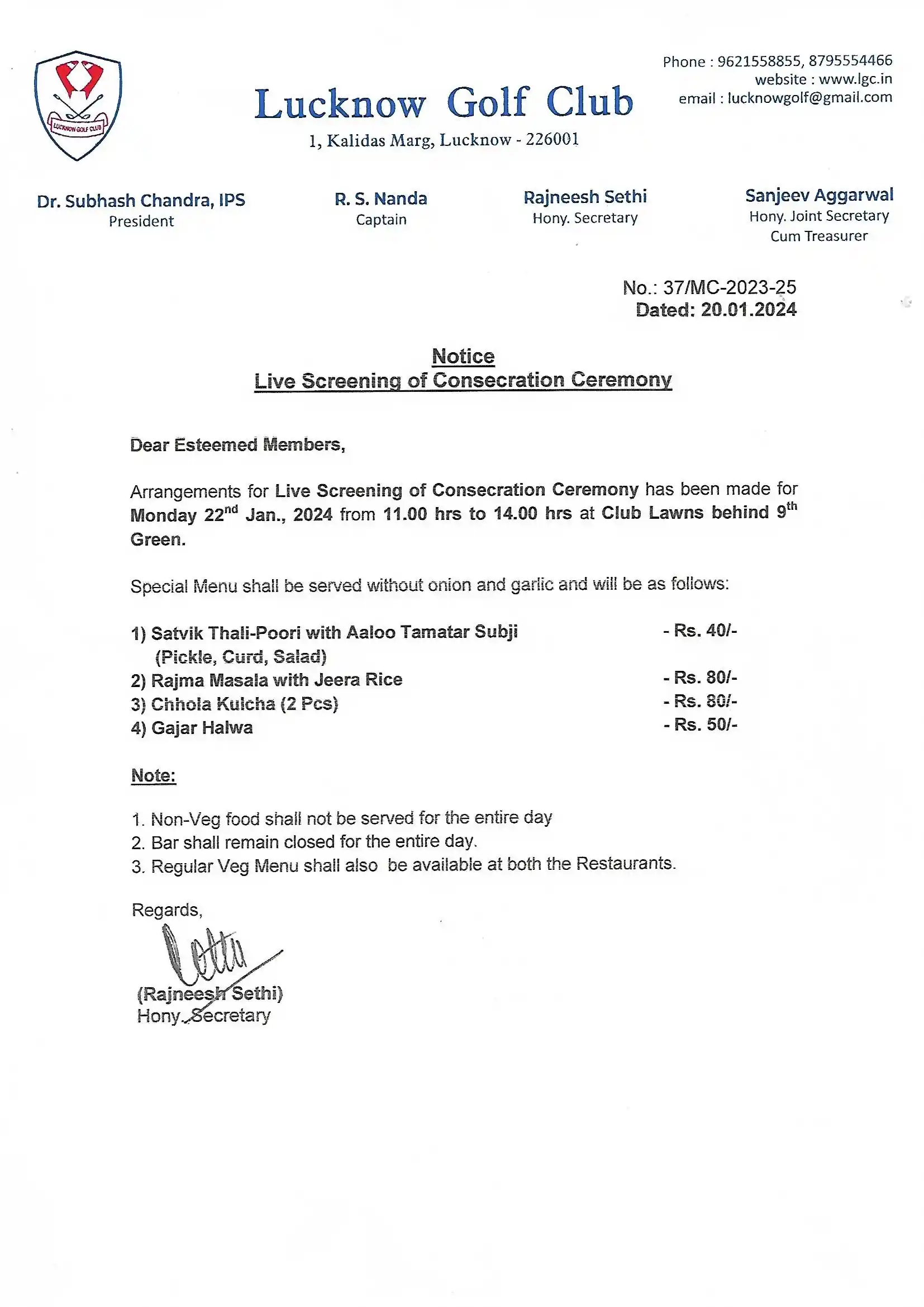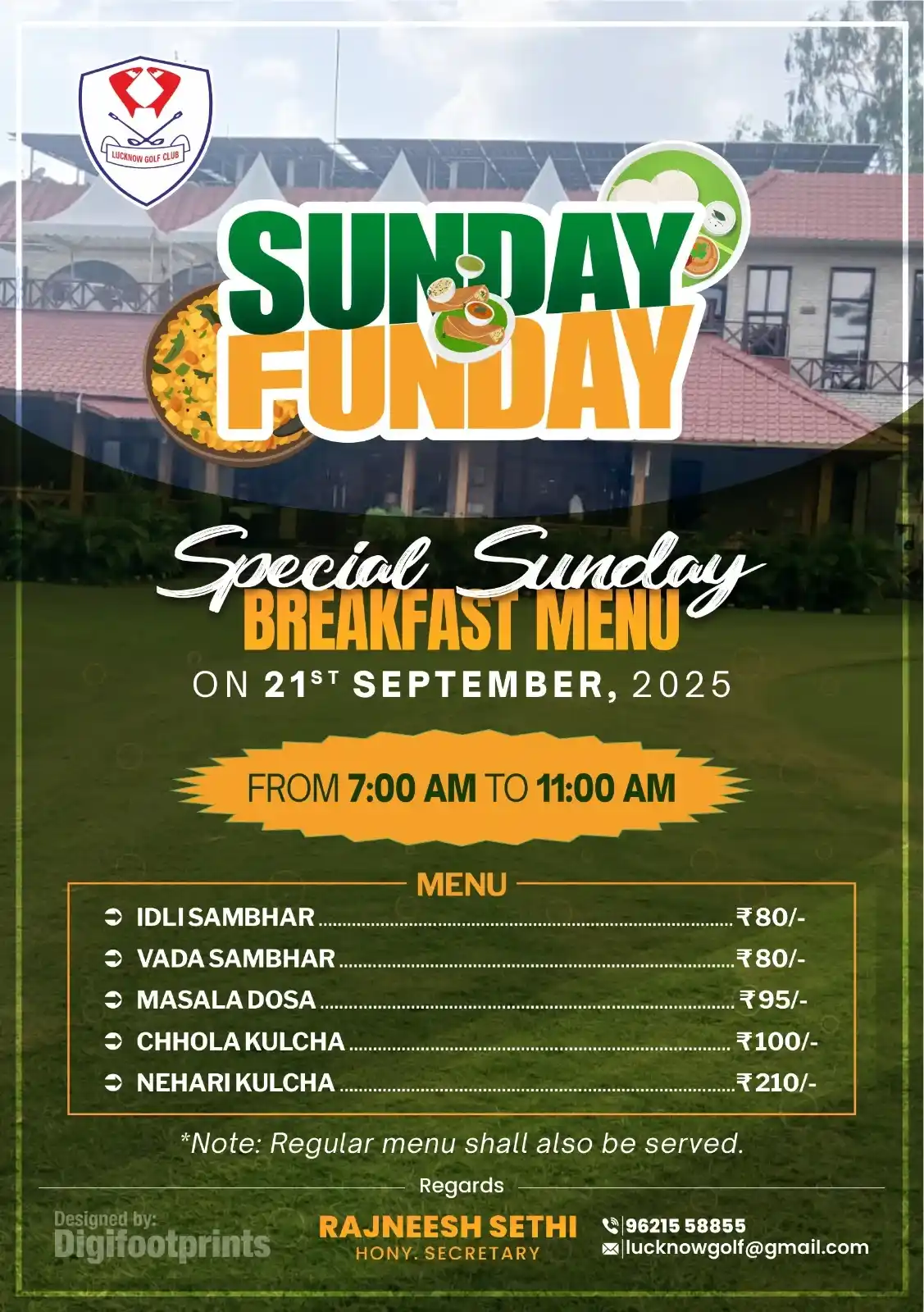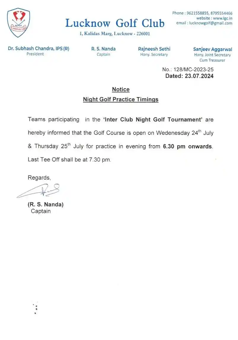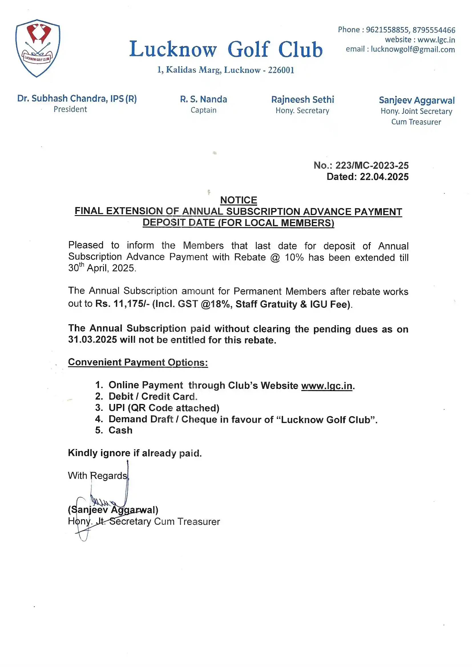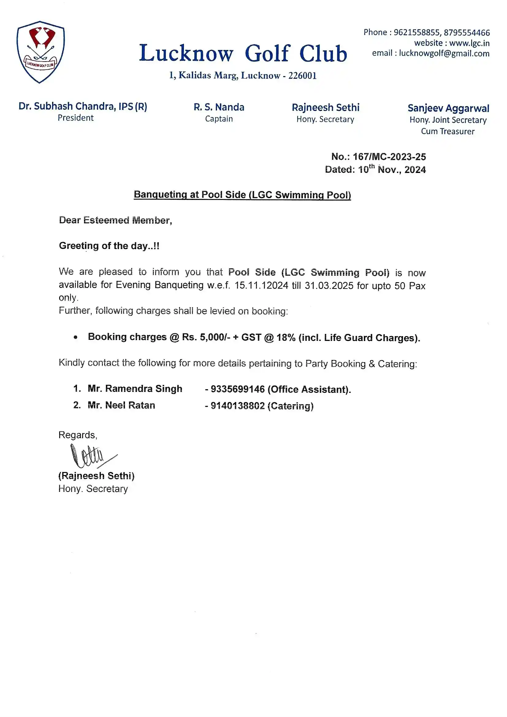 PROMOTIONAL SCHEMES dt. 13.11.2025 GFI Tour - 2025 Golf Tournament LGC ELECTIONS - 2025 FINAL LIST OF CONTESTANTS Notice - AGM & New Managing Committee Elections Notice & Agenda Annual General Meeting Diwali Nite - 2025 SGPGI BREAST HEALTH PROGRAM - PINK WAVE SUNDAY / FUNDAY Special Weekend Breakfast Menu Golf Driving Range Cum Practice Area Inauguration of Golf Driving Range & Practice Area MANGO FOOD FESTIVAL ITALIAN FOOD FEST SUMMER GAMES – 2025 FINAL EXTENSION OF ANNUAL SUBSCRIPTION CHARGES GYMNASIUM SUBSCRIPTION CHARGES & TIMINGS PRESIDENT’S CUP GOLF TOURNAMENT - 2025 SINGING IDOL SEASON-2 SWIMMING POOL SESSION - 2025 CAPTAINS CUP GOLF TOURNAMENT Powered by Indian Oil Grand Holi Celebration Event Holi Special Promotional Scheme Local Rules w.e.f. 05.03.2025 IND-PAK CRICKET MATCH SPECIAL PROMOTIONAL SCHEME Notice Flag Hoisting Ceremony ECSTASY– 2025 New Year Eve Celebrations Event Local Rules Revision of Monthly Subscription charges CHRISTMAS - 2024 CELEBRATION Banqueting at Pool Side (LGC Swimming Pool) DIWALI NITE Grand Dussehra Celebration & Dandiya Night Author’s Meet & Tambola Evening 9 HOLE VETERANS & OPEN CATEGORY GOLF TOURNAMENT MEXICAN FOOD FESTIVAL 78th Independence Day Special Menu NOTICE INDEPENDENCE DAY - FLAG HOISTING Notice Night Golf Practice Timings Monsoon Cup Golf Tournament Powered by Eldeco Notice Club Rules Night Golf Facility Notice Revision of Green Fees Summer Games – 2024 SWIMMING COMPETITION Summer Games – 2024 Night Golf Tournament Inauguration of “LGC Wellness Centre NOTICE - ANNUAL GENERAL MEETING NOTICE - EXTRA ORDINARY GENERAL MEETING ANNUAL SUBSCRIPTION AMOUNT DEPOSIT DATE EXTENDED Subscription Charges for Outstation Members Rebate @10% on Annual Subscription Payment NOTICE - HIRING OF GOLF CARTS SARACA CAPTAIN’S CUP GOLF TOURNAMENT LIVE STREAMING OF IPL-2024 INNAUGURAL MATCH NOTICE GOLF TOURNAMENTS GRAND HOLI CELEBRATION Notice - Live Screening of Consecration Ceremony