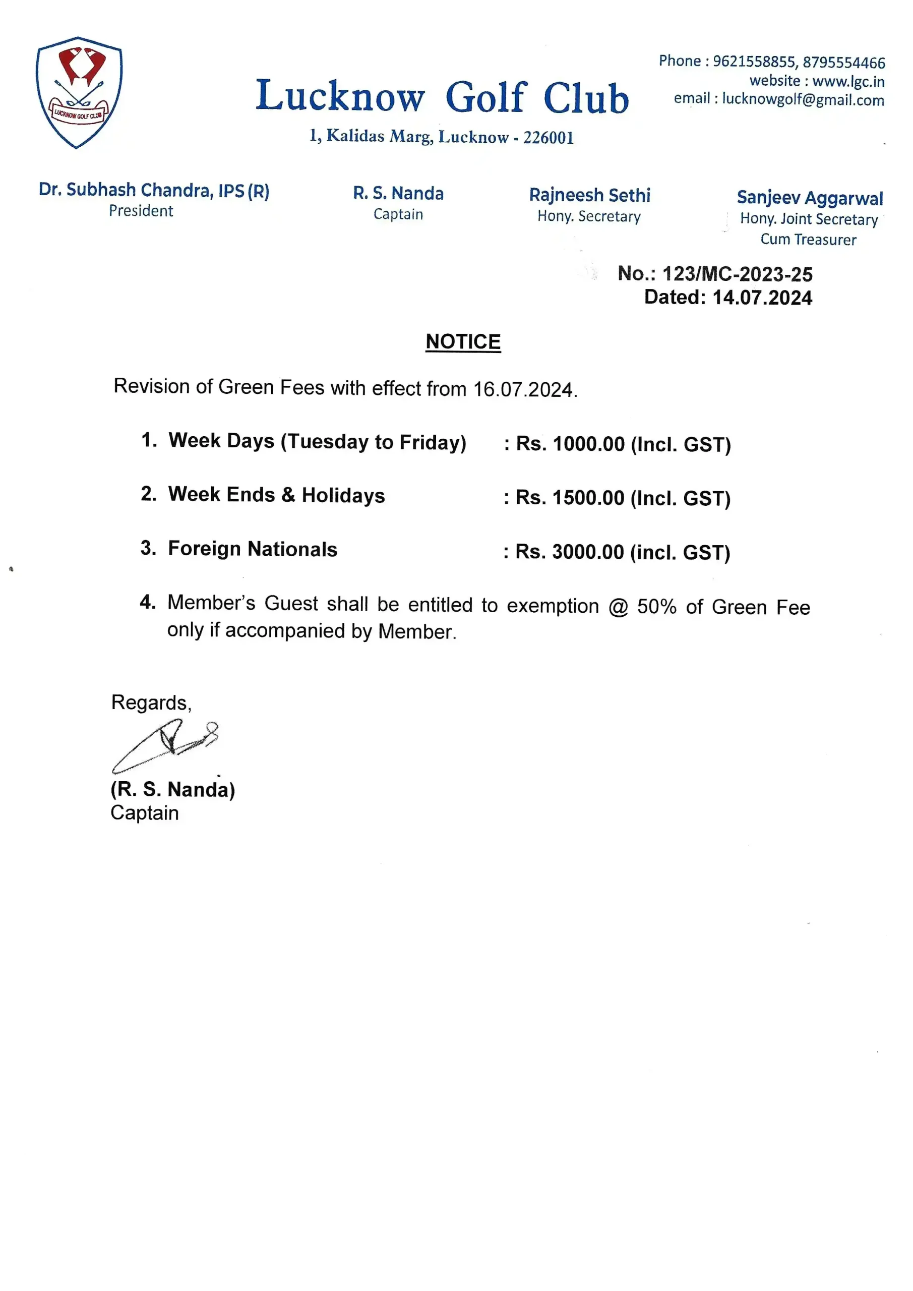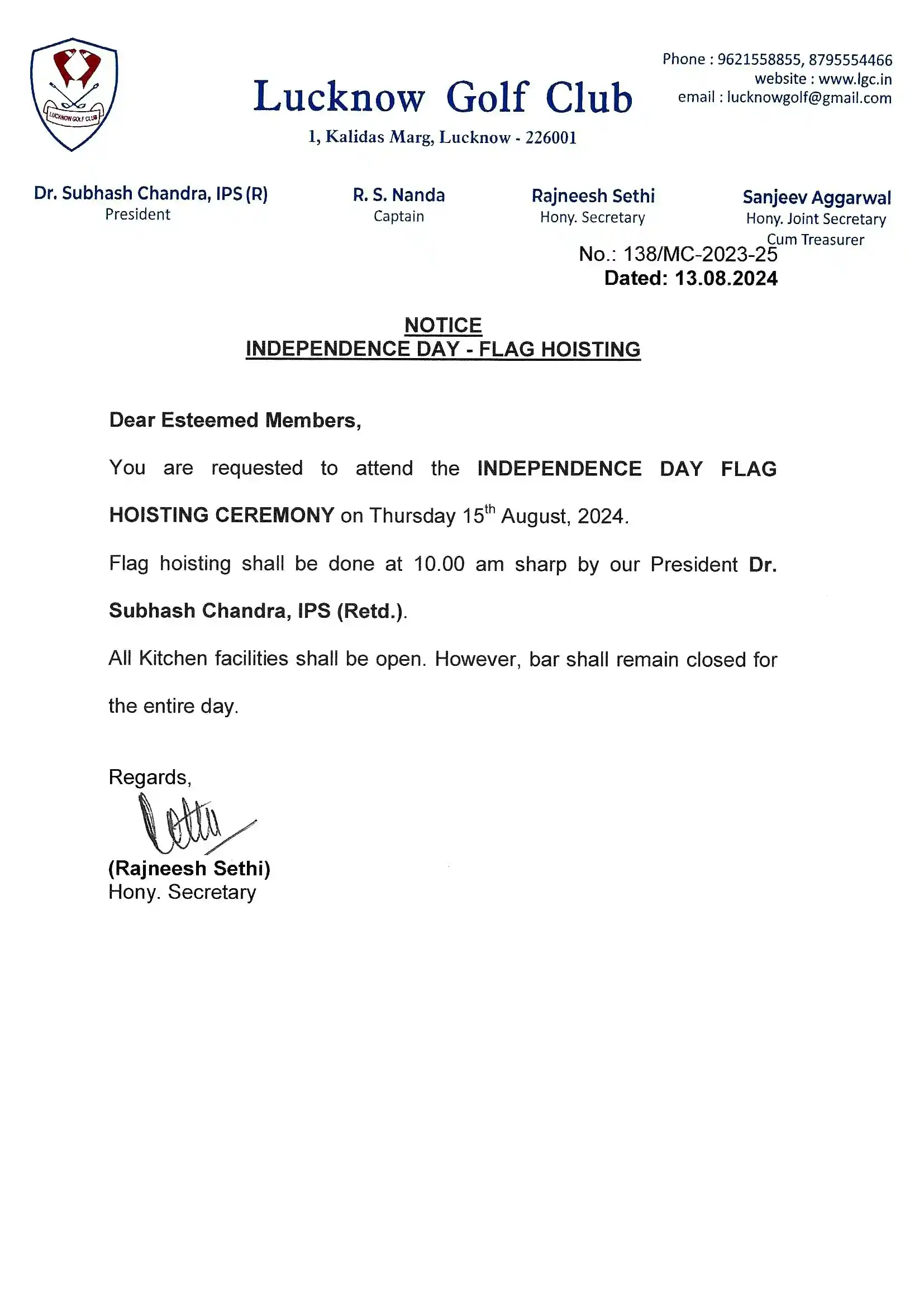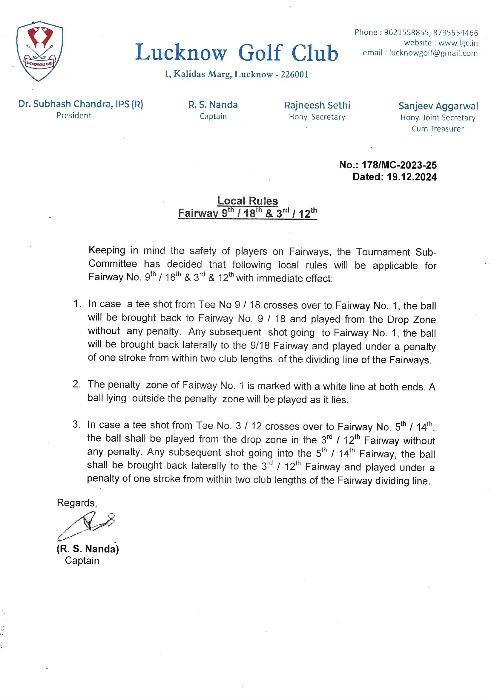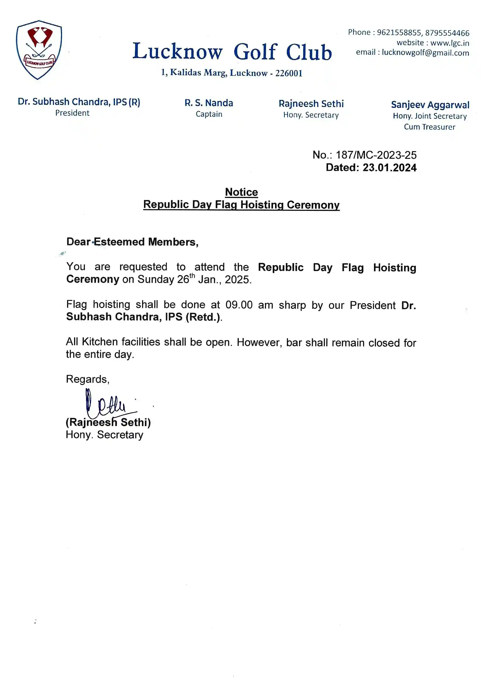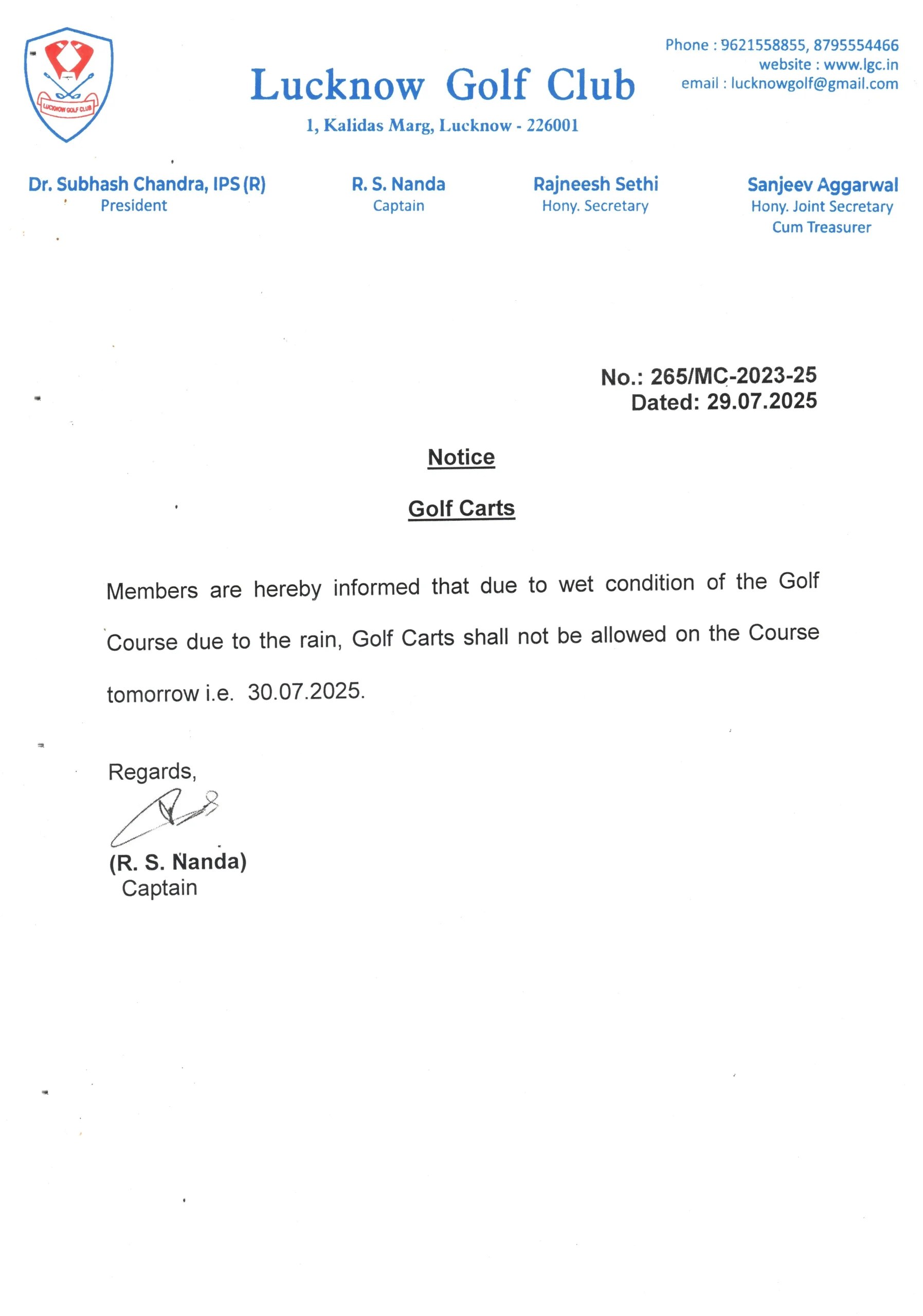 PROMOTIONAL SCHEMES dt. 13.11.2025 GFI Tour - 2025 Golf Tournament LGC ELECTIONS - 2025 FINAL LIST OF CONTESTANTS Notice - AGM & New Managing Committee Elections Notice & Agenda Annual General Meeting Diwali Nite - 2025 SGPGI BREAST HEALTH PROGRAM - PINK WAVE SUNDAY / FUNDAY Special Weekend Breakfast Menu Golf Driving Range Cum Practice Area Inauguration of Golf Driving Range & Practice Area MANGO FOOD FESTIVAL ITALIAN FOOD FEST SUMMER GAMES – 2025 FINAL EXTENSION OF ANNUAL SUBSCRIPTION CHARGES GYMNASIUM SUBSCRIPTION CHARGES & TIMINGS PRESIDENT’S CUP GOLF TOURNAMENT - 2025 SINGING IDOL SEASON-2 SWIMMING POOL SESSION - 2025 CAPTAINS CUP GOLF TOURNAMENT Powered by Indian Oil Grand Holi Celebration Event Holi Special Promotional Scheme Local Rules w.e.f. 05.03.2025 IND-PAK CRICKET MATCH SPECIAL PROMOTIONAL SCHEME Notice Flag Hoisting Ceremony ECSTASY– 2025 New Year Eve Celebrations Event Local Rules Revision of Monthly Subscription charges CHRISTMAS - 2024 CELEBRATION Banqueting at Pool Side (LGC Swimming Pool) DIWALI NITE Grand Dussehra Celebration & Dandiya Night Author’s Meet & Tambola Evening 9 HOLE VETERANS & OPEN CATEGORY GOLF TOURNAMENT MEXICAN FOOD FESTIVAL 78th Independence Day Special Menu NOTICE INDEPENDENCE DAY - FLAG HOISTING Notice Night Golf Practice Timings Monsoon Cup Golf Tournament Powered by Eldeco Notice Club Rules Night Golf Facility Notice Revision of Green Fees Summer Games – 2024 SWIMMING COMPETITION Summer Games – 2024 Night Golf Tournament Inauguration of “LGC Wellness Centre NOTICE - ANNUAL GENERAL MEETING NOTICE - EXTRA ORDINARY GENERAL MEETING ANNUAL SUBSCRIPTION AMOUNT DEPOSIT DATE EXTENDED Subscription Charges for Outstation Members Rebate @10% on Annual Subscription Payment NOTICE - HIRING OF GOLF CARTS SARACA CAPTAIN’S CUP GOLF TOURNAMENT LIVE STREAMING OF IPL-2024 INNAUGURAL MATCH NOTICE GOLF TOURNAMENTS GRAND HOLI CELEBRATION Notice - Live Screening of Consecration Ceremony