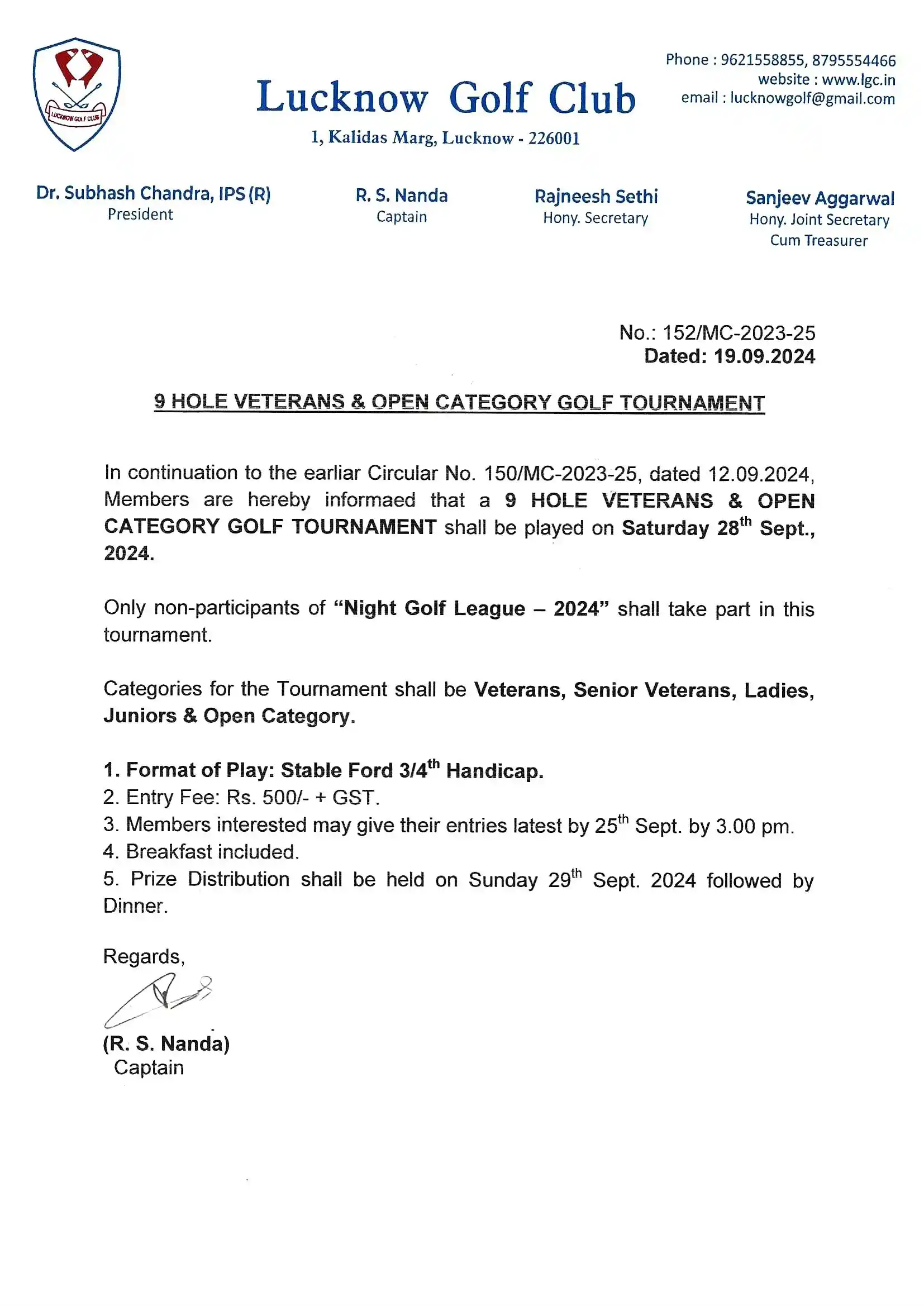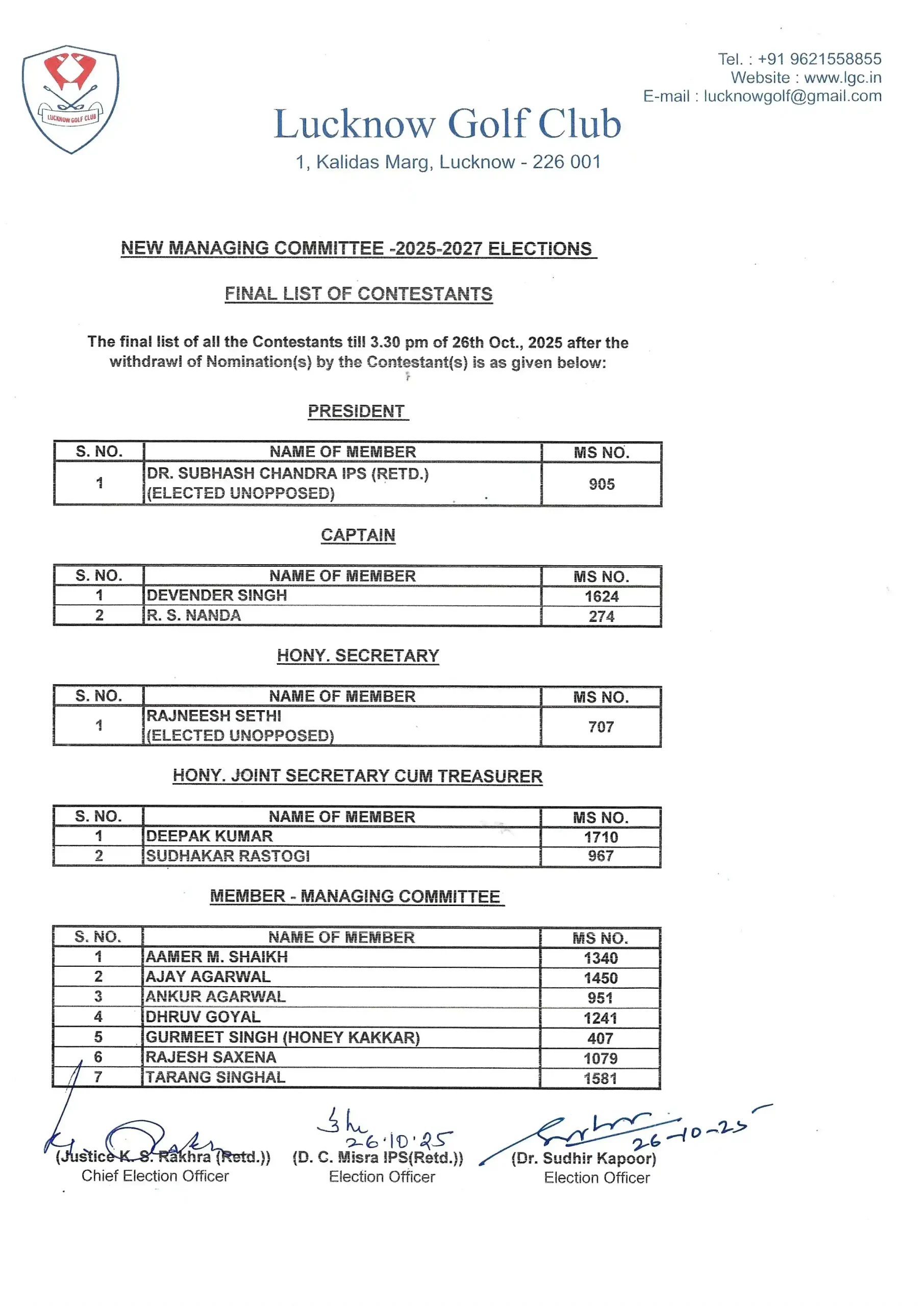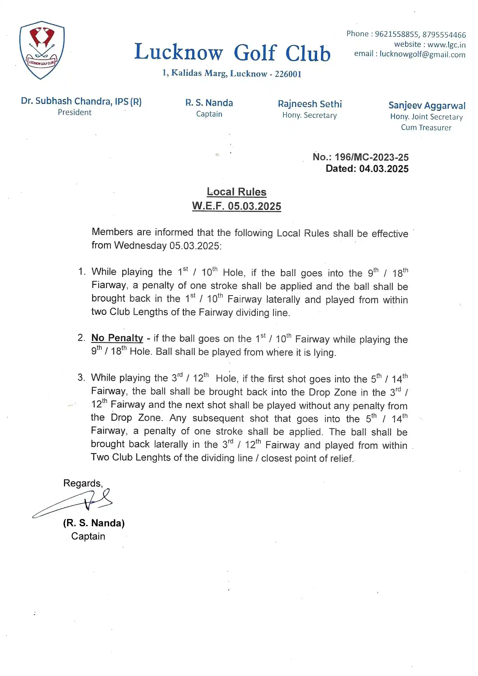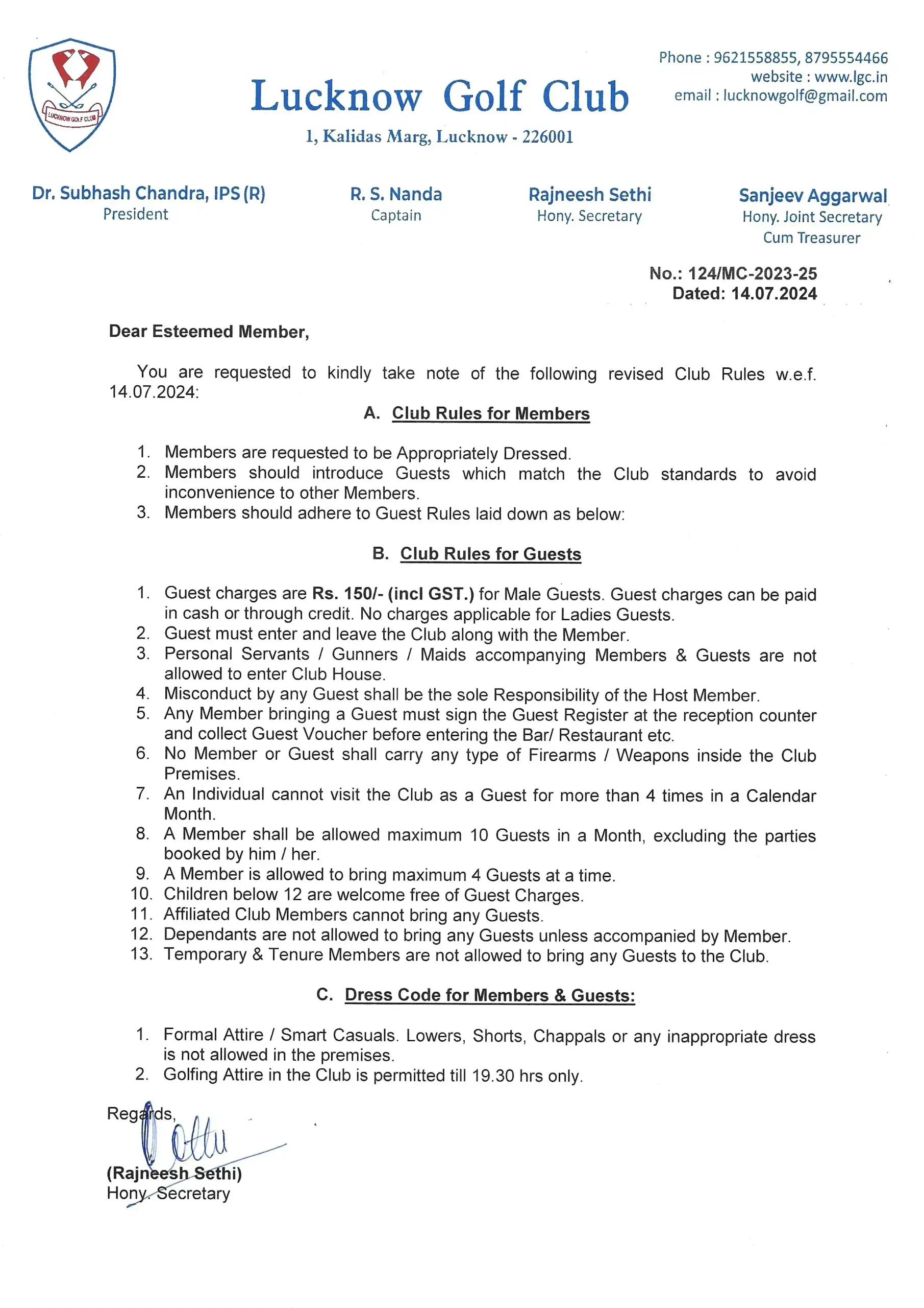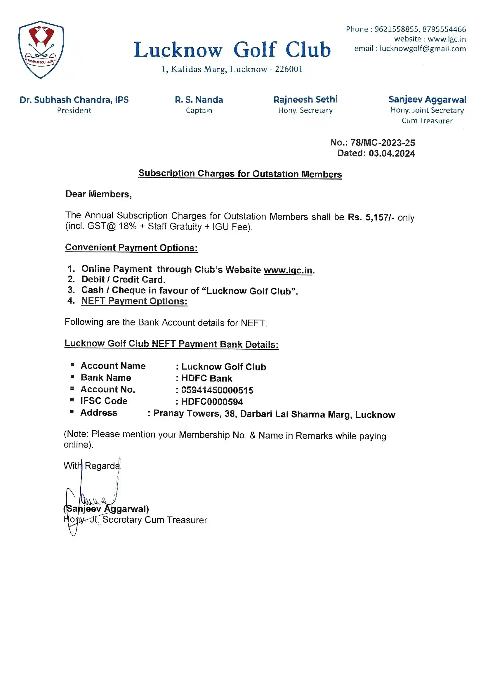 PROMOTIONAL SCHEMES dt. 13.11.2025 GFI Tour - 2025 Golf Tournament LGC ELECTIONS - 2025 FINAL LIST OF CONTESTANTS Notice - AGM & New Managing Committee Elections Notice & Agenda Annual General Meeting Diwali Nite - 2025 SGPGI BREAST HEALTH PROGRAM - PINK WAVE SUNDAY / FUNDAY Special Weekend Breakfast Menu Golf Driving Range Cum Practice Area Inauguration of Golf Driving Range & Practice Area MANGO FOOD FESTIVAL ITALIAN FOOD FEST SUMMER GAMES – 2025 FINAL EXTENSION OF ANNUAL SUBSCRIPTION CHARGES GYMNASIUM SUBSCRIPTION CHARGES & TIMINGS PRESIDENT’S CUP GOLF TOURNAMENT - 2025 SINGING IDOL SEASON-2 SWIMMING POOL SESSION - 2025 CAPTAINS CUP GOLF TOURNAMENT Powered by Indian Oil Grand Holi Celebration Event Holi Special Promotional Scheme Local Rules w.e.f. 05.03.2025 IND-PAK CRICKET MATCH SPECIAL PROMOTIONAL SCHEME Notice Flag Hoisting Ceremony ECSTASY– 2025 New Year Eve Celebrations Event Local Rules Revision of Monthly Subscription charges CHRISTMAS - 2024 CELEBRATION Banqueting at Pool Side (LGC Swimming Pool) DIWALI NITE Grand Dussehra Celebration & Dandiya Night Author’s Meet & Tambola Evening 9 HOLE VETERANS & OPEN CATEGORY GOLF TOURNAMENT MEXICAN FOOD FESTIVAL 78th Independence Day Special Menu NOTICE INDEPENDENCE DAY - FLAG HOISTING Notice Night Golf Practice Timings Monsoon Cup Golf Tournament Powered by Eldeco Notice Club Rules Night Golf Facility Notice Revision of Green Fees Summer Games – 2024 SWIMMING COMPETITION Summer Games – 2024 Night Golf Tournament Inauguration of “LGC Wellness Centre NOTICE - ANNUAL GENERAL MEETING NOTICE - EXTRA ORDINARY GENERAL MEETING ANNUAL SUBSCRIPTION AMOUNT DEPOSIT DATE EXTENDED Subscription Charges for Outstation Members Rebate @10% on Annual Subscription Payment NOTICE - HIRING OF GOLF CARTS SARACA CAPTAIN’S CUP GOLF TOURNAMENT LIVE STREAMING OF IPL-2024 INNAUGURAL MATCH NOTICE GOLF TOURNAMENTS GRAND HOLI CELEBRATION Notice - Live Screening of Consecration Ceremony